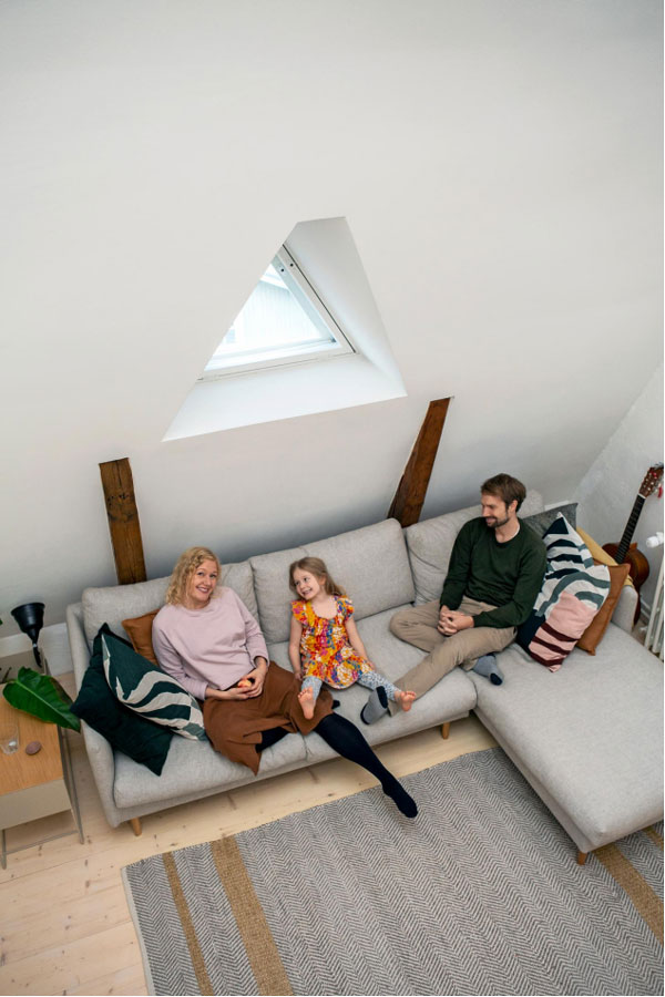 当安娜和尤哈第一次看到阁楼空间时,他们被它的本质惊呆了。“广告里有一张阁楼的照片,但完全没有展现出空间的优雅和高度。你必须亲眼看到这个空间,建筑师的头脑立即开始思考所有的可能性,”安娜说。女儿艾莎坐在父母中间。